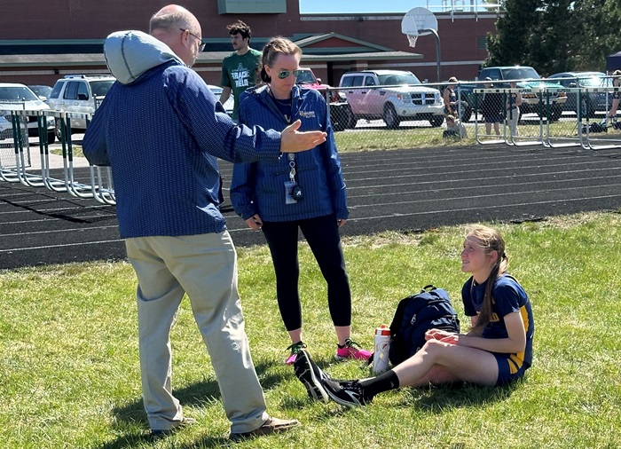 PHOTOS (Top) Gaylord’s Katie Berkshire readies for a relay Wednesday against Alpena. (Middle) Berkshire, seated, confers with the Blue Devils coaches. (Photos provided by the Gaylord girls track & field program.)