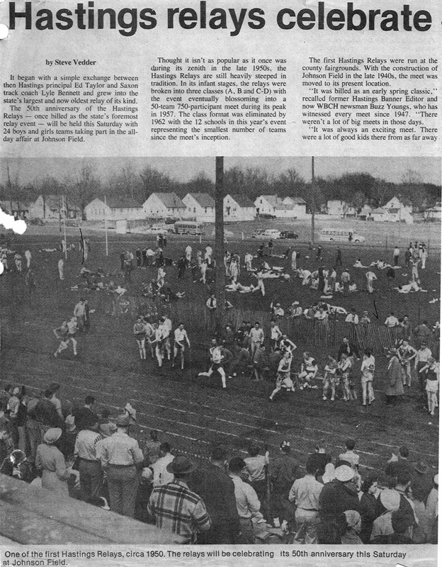 The Hastings Relays, which has changed formats and even names during its nearly nine-decade history, would traditionally kick off the track season. The meet was originally held at a makeshift quarter-mile track which surrounded the town's fairgrounds and was part of the city's annual Hastings Carnival – the track would become the midway during fair time.