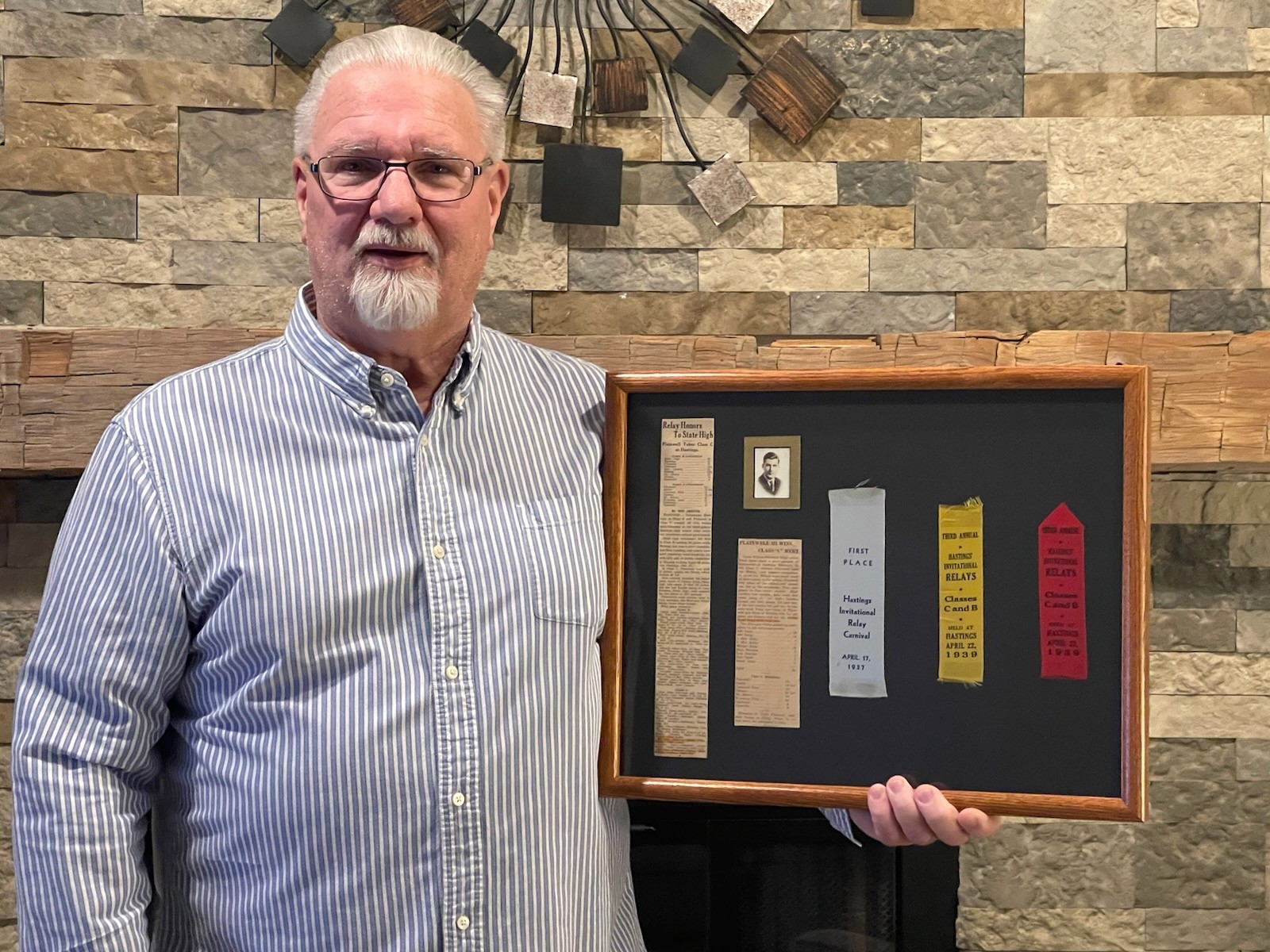 PHOTOS (Top) Racers run at the Hastings Relays, with several more awaiting their turns to compete at the longtime meet. (2) The author wrote on the 50th anniversary of the Relays for the Hastings Banner nearly 40 years ago. (3) Past athlete, coach and athletic director Steve Hoke shows some of the Relays awards from the 1930s. (4) Tom Duits was one of the state’s biggest track stars of the 1970s and ran in three Hastings Relays. (Top photo by Dan Goggins, Hoke photo provided by Steve Hoke and Duits photos provided by Tom Duits.)