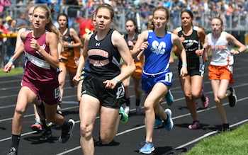 PHOTOS: (Top) Lake Linden-Hubbell’s 800 relay anchor extends past the finish line during Saturday’s Finals. (Middle) Munising’s Madeleine Peramaki, second from left, leads the pack around a bend during the 1,600. (Photos by Cara Kamps. Click for more at RunMichigan.com.)