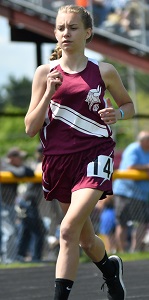 PHOTOS: (Top) Rock Mid-Peninsula's Camryn Croadsell, left, and Lake Linden-Hubbell's Joslyn Perala charge toward the finish in the 400 relay. (Middle) North Dickinson's Sophie Mattson runs the 3,200. (Photos by Cara Kamps.)