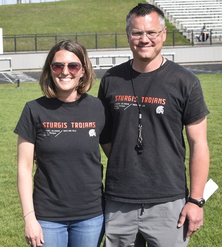 PHOTOS (Top) Vivian Massey competes in the adaptive shot put during last season’s Lower Peninsula Division 1 Finals. (Middle) Sturgis High School track & field coaches Leslie and JB Starkey stand for a photo during a Trojans' practice last week. (Below) Massey, right, receives congratulations from Fenton’s Molly Katic, left in wheelchair, following last year’s Finals shot put competition at East Kentwood. (Finals photos provided by JB Starkey. Coaches photo by Scott Hassinger.)
