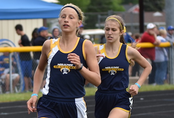 PHOTOS: (Top) Marquette’s Ahnika Puskala, right, and Jacqueline Cammarata charge ahead in the 100 hurdles final; Puskala won the race and Cammarata came in third. (Middle) Negaunee teammates Clara Johnson, front, and Emily Paupore round a corner on the way to taking the top two places in the 1,600. (Photos by Cara Kamps.)