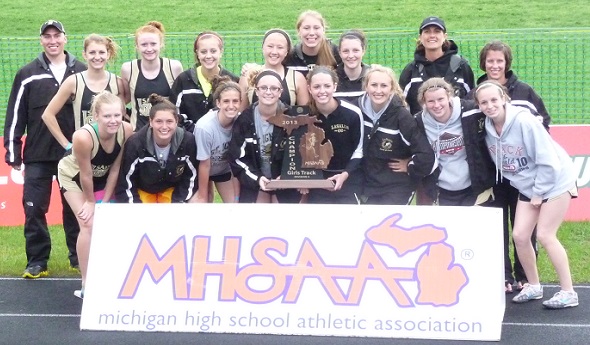 PHOTOS: (Top) St. Ignace's Sarah Cullip, here in the 1,600, won that race and both the 800 and 3,200 on Saturday. (Photo by Paul Gerard. Click to see more photo coverage from RunMichigan.com.) (Middle) The St. Ignace girls track and field team poses with its fourth-straight MHSAA championship trophy. (Photo courtesy of St. Ignace High School.)