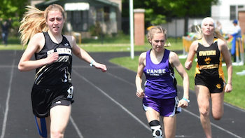 PHOTOS: (Top) St. Ignace’s Libby Becker checks the clock as she approaches the finish line in the 800 on Saturday. (Middle) The Saints’ Ally Schultz, far left, wins the 200. (Photos by Cara Kamps.)
