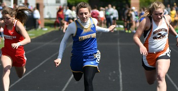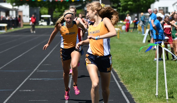 PHOTOS: (Top) Negaunee’s Emily Paupore checks to make sure teammate Clara Johnson will finish second to her in a race Saturday; they came in first and second, respectively, in three events. (Middle) Kingsford’s Olivia Allen breaks across the line first in the 100-meter dash. (Photos by Cara Kamps. Click for more at RunMichigan.com.)