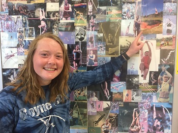 PHOTOS: (Top) Boyne City’s Anna Harmeling prepares to begin her pole vault approach. (Middle) Harmeling clears the bar during a meet. (Below) Harmeling points to her spot on coach Andy Bryant’s board of honored pole vaulters. (Photos courtesy of Anna Harmeling.)