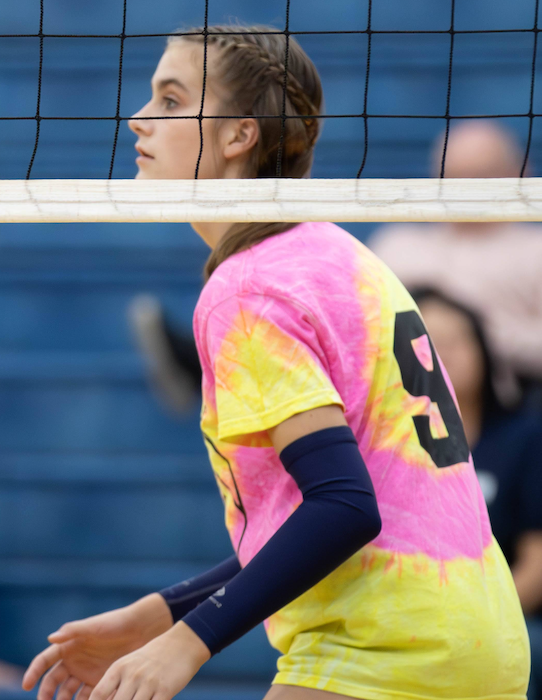 PHOTOS (Top) Yale’s Sadie Dykstra launches into a long jump last spring. (Middle) Dykstra brings the ball upcourt against Armada. (Below) Dykstra stands at the net during volleyball season. (Photos courtesy of the Dykstra family.)