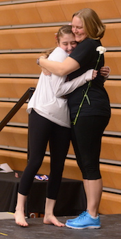 PHOTOS: (Top) Rachel Hogan, center, stands atop the podium Saturday as the Division 1 all-around placers are honored. (Middle) Grosse Pointe United’s Isabelle Nguyen performs her beam routine. (Below) Livonia Blue’s Brianna Rhoad hugs coach Lisa Broomfield. (Click to see more at HighSchoolSportsScene.com.)