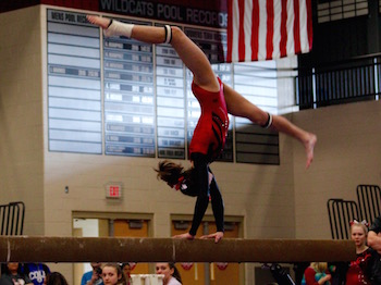 PHOTOS: (Top) Rockford coach Alyssa Burke (right) embraces one of her gymnasts after the team's final rotation Friday. (Middle) A Rams gymnast performs on bars. (Below) A Canton gymnast performs her beam routine. (Click to see more at HighSchoolSportsScene.com.)