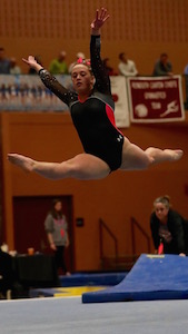 PHOTOS: (Top) Grosse Pointe United’s Cate Gagnier begins her floor exercise routine during Saturday’s Finals. (Middle) Port Huron United’s Hallie Roman goes aerial during her floor routine. (Below) Farmington United Elisa Bills performs on balance beam. (Click for more from HighSchoolSportsScene.com.)