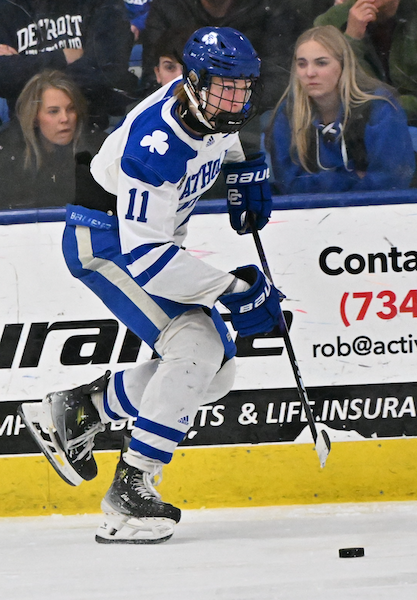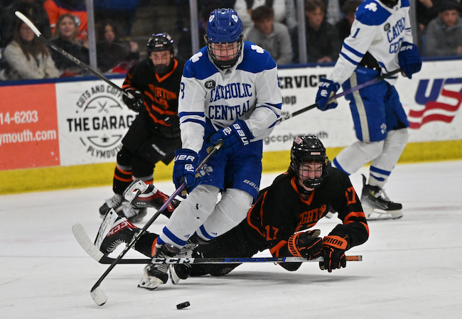There have been Finals in which it didn’t seem to matter who was between the pipes for Catholic Central, which dominated puck possession more often than not. But this was an even battle against a perennial Division 1 contender, one in which the Shamrocks held a slim 28-25 advantage in shots.