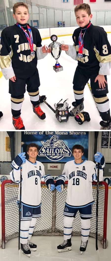 PHOTOS (Top) Mona Shores’ Nathan Tilden (8) makes his way up the ice with the puck as twin brother Brady Tilden (18) trails the play. (Middle) The Tildens show off a trophy early in their youth hockey careers, and then take a photo together during the team’s media day this season. (Below) Nathan Tilden raises his leg to allow linemate Eli Habetler's shot past and into the goal against Muskegon Reeths-Puffer last season. Twin brother Brady Tilden looks in on the play. (Action photos by Eric Sturr; posed photos courtesy of the Tilden family.)