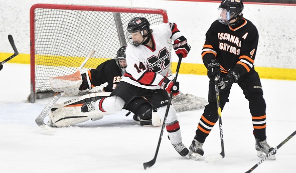 PHOTO: Marquette's Joseph Luke (14) deflects a shot past the Escanaba goalie during a December win. (Photo by Cara Kamps.)