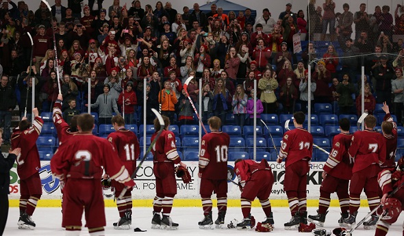 PHOTOS: (Top) Hancock players celebrate after their Division 3 Final win over Grand Rapids Catholic Central last month. (Middle) The Bulldogs turn to salute fans who also made the 500-mile trip to USA Hockey Arena.