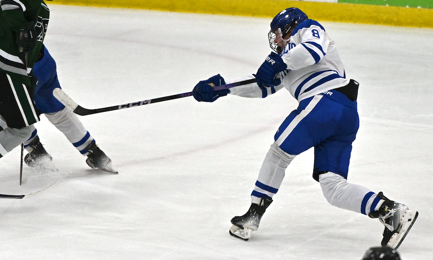 Byron Center’s Collin Storey (22) rockets a shot during his team’s 6-2 Division 2 Semifinal win over Saginaw Heritage. He assisted on the game’s first goal.