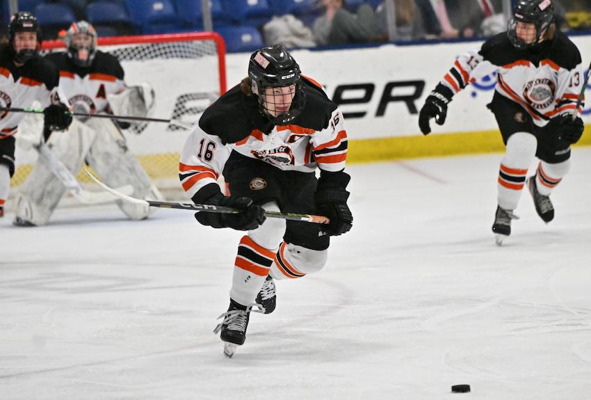 Brighton’s Cameron Duffany (16) leads a rush up the ice during his team’s overtime 4-3 Semifinal win over Clarkston. He scored the game’s first goal and added a second during the second period.