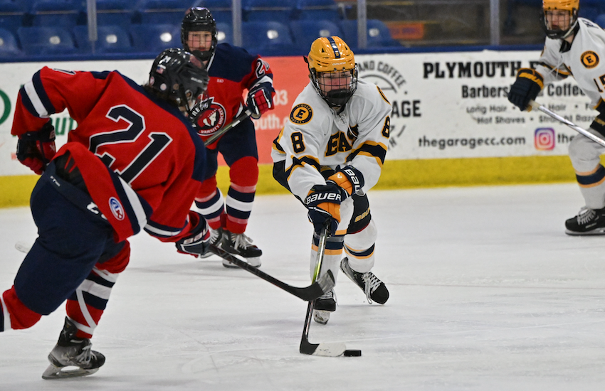 East Grand Rapids senior Ian MacKeigan charges toward the puck during his team’s 3-0 win over Traverse Bay Reps as the Pioneers earned their second-straight championship game berth.