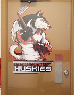PHOTOS: (Top) Coach JD Kalleward has spent 30 seasons behind the Portage Northern bench. (Middle) Joe Mancina, center, was last season's top state academic athlete with a 4.65 GPA. He is joined by, from left, all-state team selection Mitchell Kalleward, former NHL player Mike Knuble, Northern all-stater Matty Seiferlien and Coach JD Kalleward. (Below) The Huskies' locker room door. (Head shots) From left: JD Kalleward, Jack Budnick and Austin Killman. (Top two photos courtesy of JD Kalleward; bottom photo and head shots by Pam Shebest.)