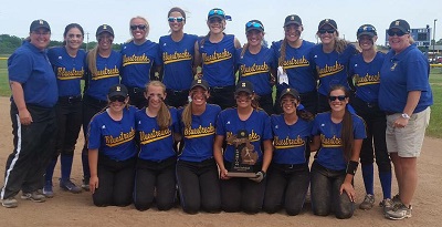 PHOTOS: (Top) Ida coach Dawn Forter and her players celebrate Brooklyn Woelmer (14) scoring the tying run during the seventh inning of the Division 2 Final. (Middle) The Bluestreaks, after winning an earlier round of the MHSAA Tournament.