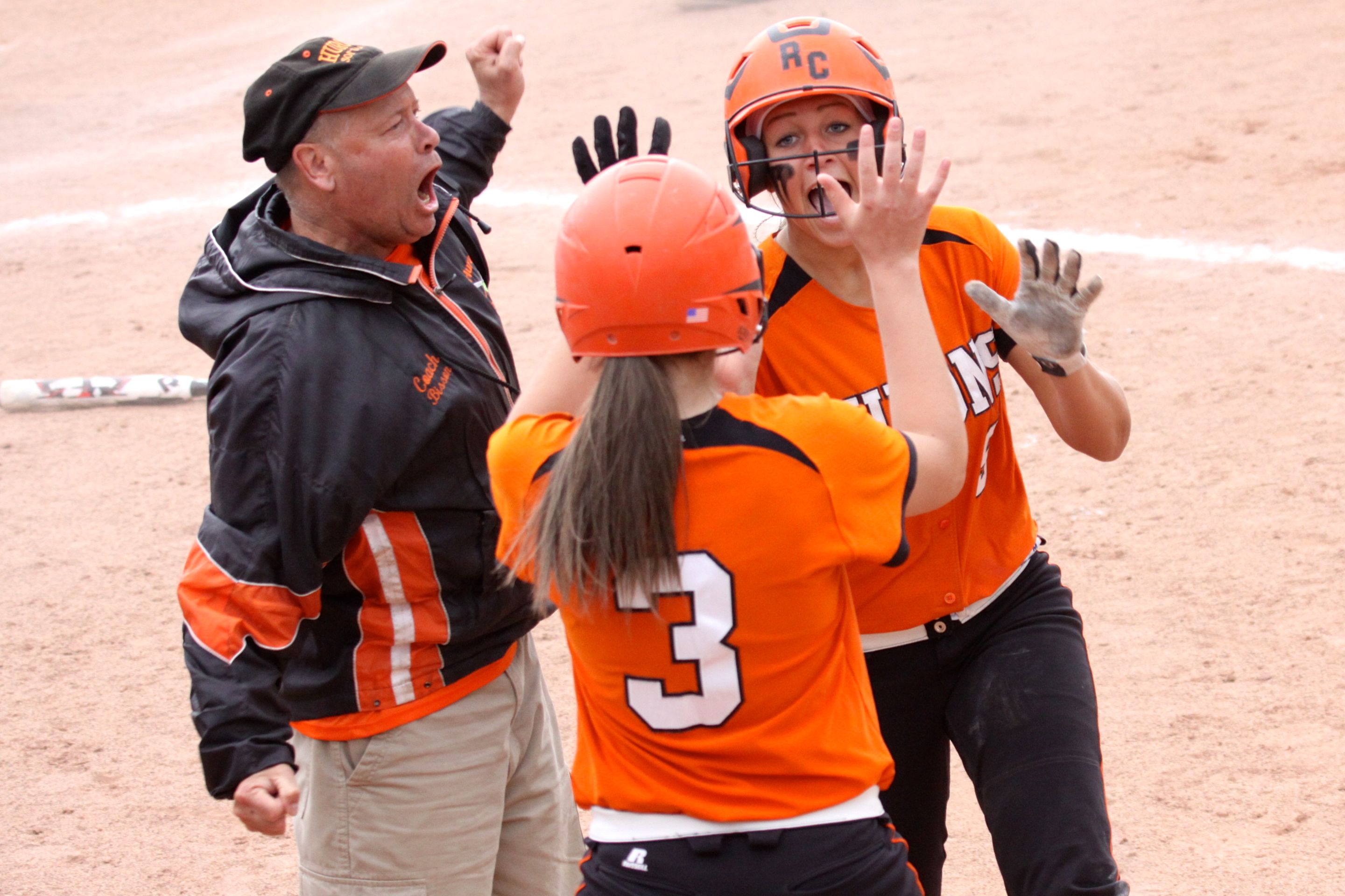 PHOTOS: (Top) Kalamazoo Christian catcher Kara Gjeltema fires a throw during her team’s Semifinal win Friday. (Middle) Rogers City’s Kayla Fleury (3) and Courtney Streich (9) celebrate Saturday during their win over Fowler.