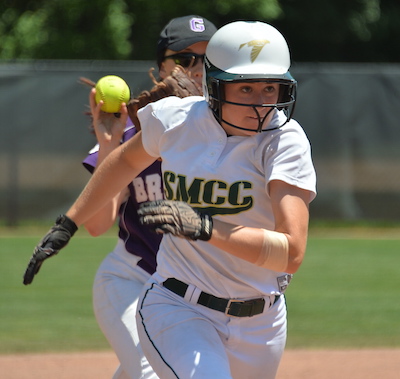 PHOTOS: (Top) Calvin Christian players, including Sarah Elderkin (7) celebrate Friday’s Division 3 Semifinal win. (Middle) A Monroe St. Mary’s runner tries to beat out a Gladstone fielder pursuing with the ball.