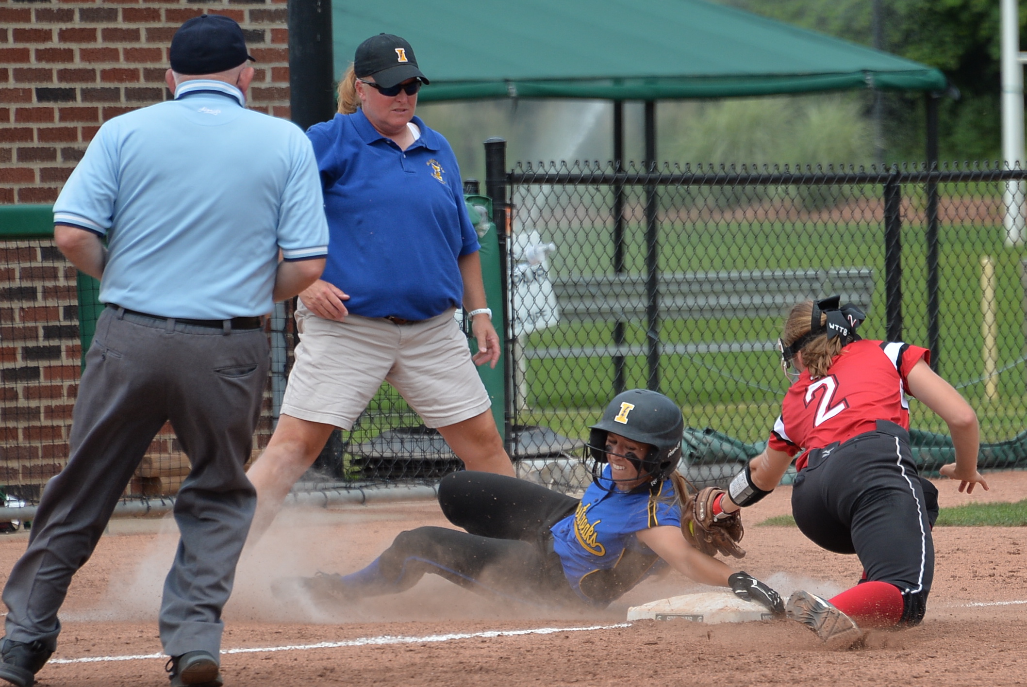PHOTOS: (Top) Richmond pitcher Erin Shuboy prepares to fire during Thursday's Division 2 Semifinal win over Escanaba. (Middle) Ida's Karlee Lambert gets to third base ahead of a tag after hitting one of her two triples Thursday.