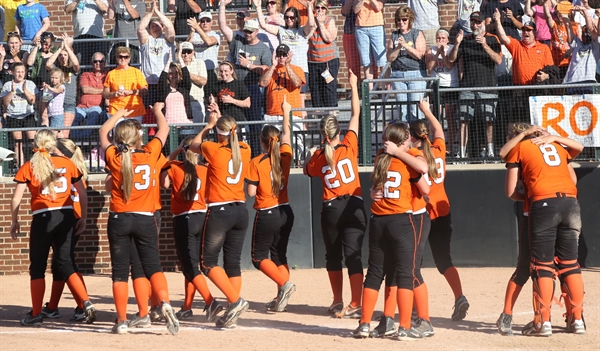PHOTOS: (Top) Rogers City players are cheered on by their fans after winning the Division 4 championship at Secchia Stadium. (Middle) Hurons centerfielder Cassie Brege throws the ball in during Saturday’s Final.