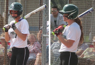 PHOTOS: (Top) Sydney Coe winds up during Wednesday's doubleheader at East Jackson. (Middle) Paige Kortz waits on a pitch Wednesday. (Below) Kortz, left and Rachel Griffin are two of a strong group of seniors leading the Pirates. (Photos by Chip Mundy.)