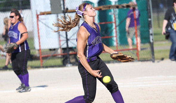 PHOTOS: (Top) Swan Valley pitcher Courtney Reinhold warms up Friday on the way to beating Linden 5-2. (Middle) Tecumseh second baseman Claire Burnett tosses to first base during her team's Semifinal win over Ladywood. (Click to see more from Hockey Weekly Action Photos.)