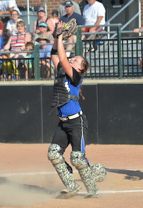 PHOTOS: (Top) Indian River Inland Lakes' Cloe Mallory unloads a pitch during last season's Division 4 championship game. (Middle) Catcher Pam Braund secures a pop fly against Unionville-Sebewaing.