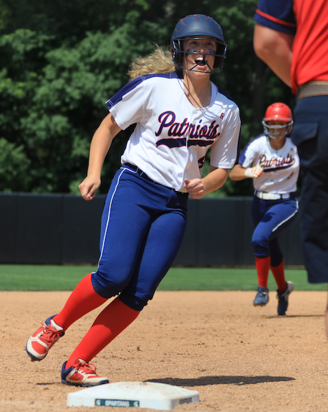 PHOTOS (Top) Teammates welcome USA’s Jenna Gremel (13) home during Saturday’s Division 4 Final. (Middle) Olivia Jubar (4) rounds third base. (Below) Rylie Betson makes her move toward the plate for the Patriots. (Photos by Olivia Napier/Hockey Weekly Action Photos.)
