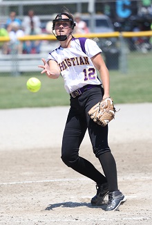 PHOTOS: (Top) Ubly first baseman Lindsey Briolat prepares to scoop up a grounder during Friday's Semifinal win over University Liggett. (Middle) Kalamazoo Christian pitcher Stephanie VanderLugt delivers during her shutout of Rogers City. (Click to see more from Hockey Weekly Action Photos.)
