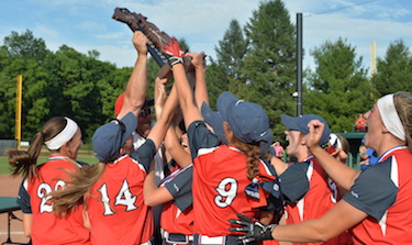 PHOTOS: (Top) Unionville-Sebewaing’s Nikki Bauer prepares to fire a pitch during the Division 4 Final. (Middle) The Patriots celebrate their latest championship at Secchia Stadium.