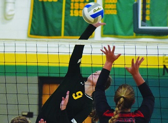 PHOTOS: (Top) Carney-Nadeau’s Taylor Kedsch (10) unloads a spike against Bark River-Harris during a match this season. (Middle) The Wolves Liana Blahnik (9) spikes the ball against Crystal Falls Forest Park. (Photos courtesy of the Escanaba Daily Press.