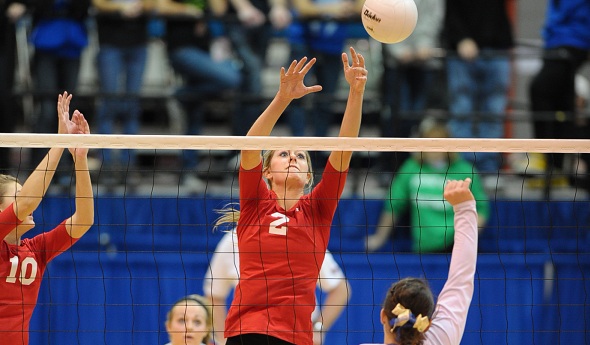 PHOTO: Battle Creek’s St. Philip’s Amanda McKinzie blocks a hit during last season’s Class D Semifinals at Kellogg Arena.
