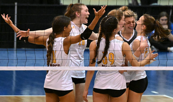 PHOTOS (Top) Campbell Flynn (28) sets Farmington Hills Mercy’s attack during last season’s Division 1 championship win over Grand Rapids Forest Hills Northern. (Middle) Flynn and her teammates enjoy a moment during their Semifinal win over Clarkston.