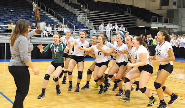 PHOTOS: (Top) Gabriel Richard players rush toward coach Mayssa Bazzi as she presents the Class B championship trophy. (Middle) Emily Tanski (3) pushes a ball over the net for the Fighting Irish.