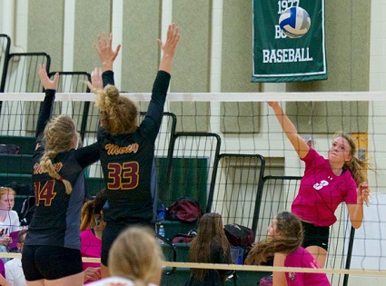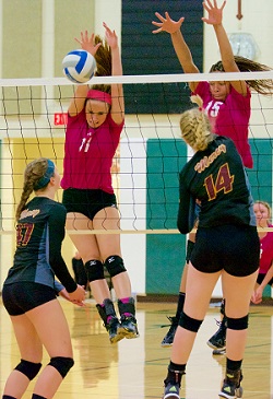PHOTOS (Top) Kingsley’s Sarah Wooer (6) sets for teammate Jenna Middleton (11) on Saturday as Kalamazoo Christian’s Elliana VanDusen prepares to defend. (Middle) Kingsley’s Aizlyn McKinley sends a kill attempt toward the net and Kalamazoo Christian blockers Ashlyn Triemstra (14) and Lydia Boley (7).