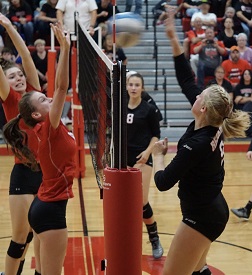 PHOTOS: (Top) Camden-Frontier’s Jordan Stump prepares to serve during a match this season. (Middle) Stump, right, works to put the ball past a block. (Photos courtesy of the Camden-Frontier athletic department.)