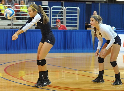 PHOTOS: (Top) East Grand Rapids players celebrate their first MHSAA volleyball championship at Kellogg Arena. (Middle) Marian’s Alannah Barash prepares to smash a potential kill Saturday. (Below) East Grand Rapids libero Jamie Wolffis connects on one of her 14 digs in the Final.