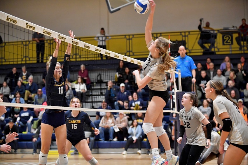 PHOTOS (Top) Adrienne Greschaw (1) sets the North Branch attack during its Quarterfinal win over Frankenmuth. (Middle) Clarkston's Rylee Hunt (11) prepares to put up a block as Macomb L'Anse Creuse North's Kate Schneider connects during their Division 1 Quarterfinal. (Photos by Terry Lyons.)