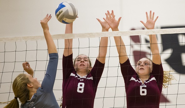 PHOTOS: (Top) Buchanan's Britta Mollberg (8) and Andrea Bair (6) wall off a kill attempt earlier this season. (Middle) Libero Taylor Strauss dives for a dig. (Photos courtesy of the South Bend Tribune/Michael Caterina.)