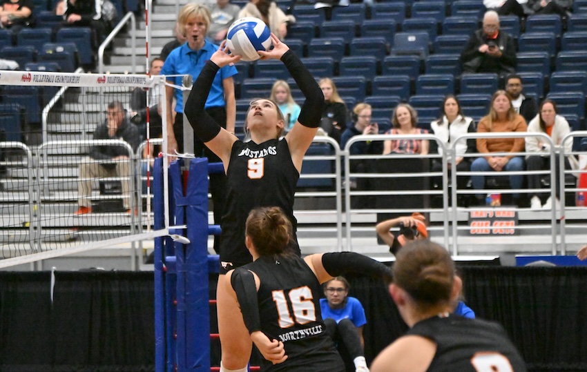 Northville’s Ella Craggs (9) sets for Elle Chenowith (16) during their team’s 25-20, 20-25, 25-19, 25-22 Division 1 Semifinal win over Bloomfield Hills Marian (45-8).