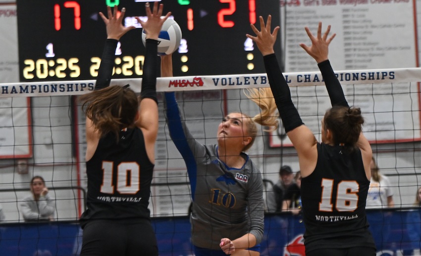 Marian’s Jayla Zayti works to get a ball past Northville’s Mallory Reck (10) and Chenowith (16). Zayti finished with six kills and seven blocks, while Reck had 18 kills and four blocks, and Chenowith had three blocks.