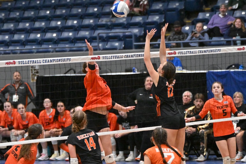 A Fenton player and Rockford's Grace Crelly (12) meet at the net of the second Division 1 Semifinal. Crelly finished with five kills in the Rams’ 25-12, 25-14, 25-8 victory.