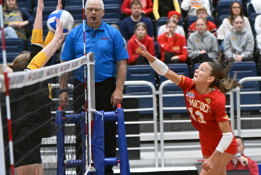 Hancock’s Brooke Koskela (13) puts a ball through an Everest block. Koskela finished with 10 kills for the Gremlins (25-7-2).