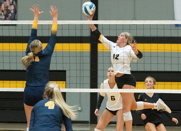 PHOTO Shelby's Navea Gauthier goes up for a kill attempt during a 2022 match. (Photo by Farmer's Fotos.)