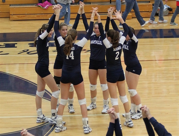 (TOP) One goal: Marysville's volleyball player join together before the start of Tuesday's Quarterfinal match against Frankenmuth at North Branch.