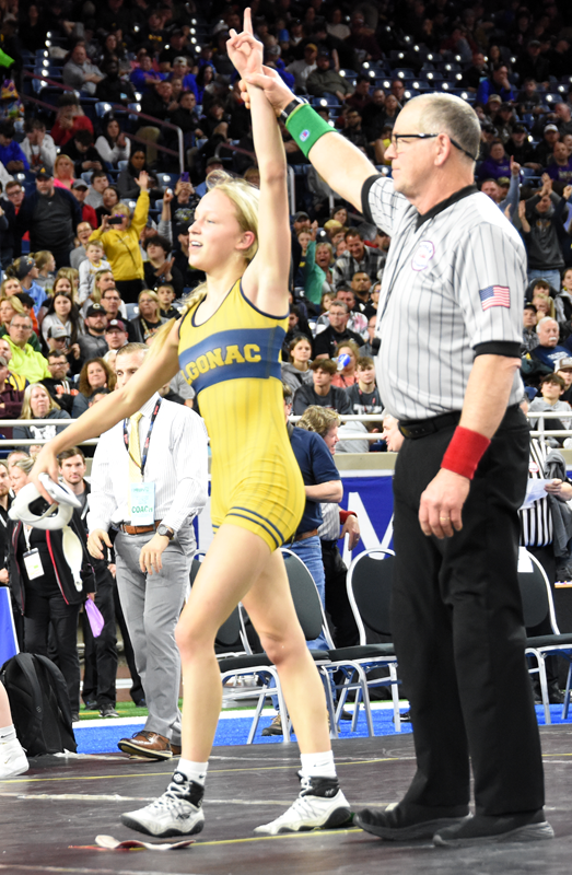 PHOTOS (Top) Algonac’s Sky Langewicz, left, wrestles Gaylord’s Sunni LaFond during last season’s Individual Finals at Ford Field. (Middle) Langewicz’s arm is raised in victory. (Click for more from High School Sports Scene.)
